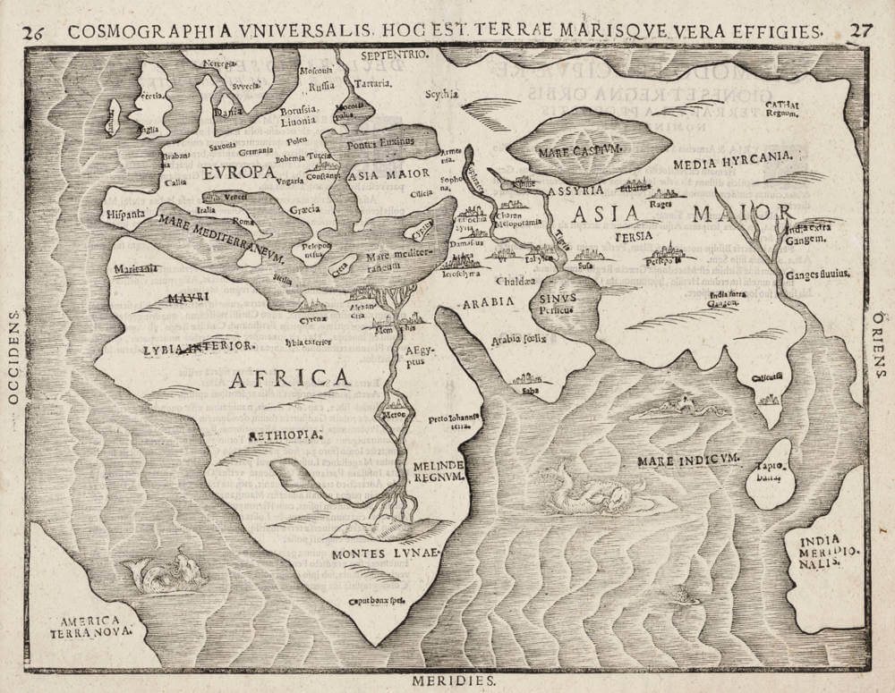 The Mediterranean Sea is linked to the Black Sea by a waterway that extends all the way through Europe, presumably to the Arctic. Taprobana (Ceylon) is labelled but no landmass is charted. The seas are adorned with sea monsters and many major cities are indicated and named.