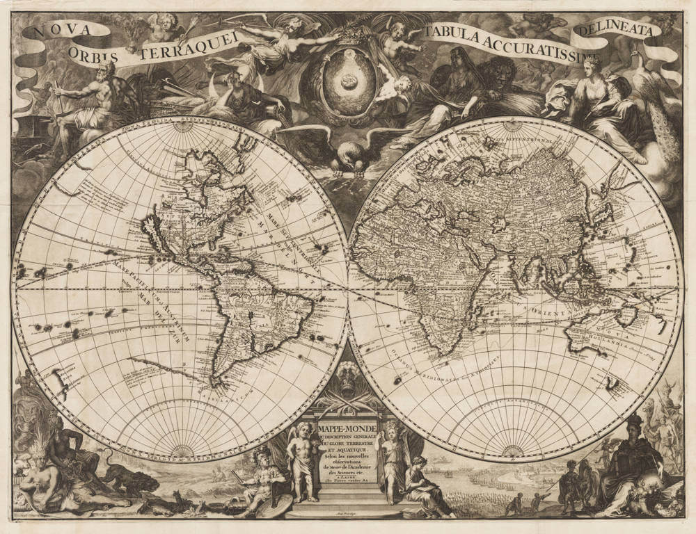 Produced circa 1713, this double-hemisphere world map shows the synthesis of scientific advancement and artistic characteristic of the period. Measuring approximately 50 by 65 centimeters at plate mark, it is a very large copperplate engraving, allowing for detailed rendering of the continents, oceans, and decorative elements. Van der Aa, active from 1690 to 1733, drew upon the latest geographical compilations, incorporating data from Guillaume Delisle and other French cartographers, while adhering to the prevailing Dutch style influenced by masters like Frederik de Wit and Johannes Blaeu.