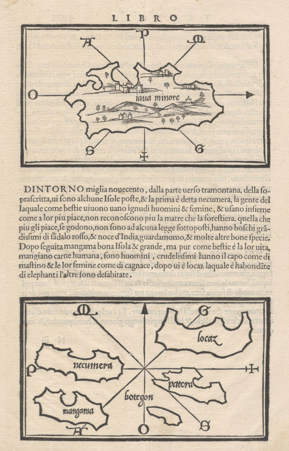 The upper map depicts Iaua Minore, one of the islands described by Marco Polo, adorned with a eight-point compass rose for wind directions. The island is identified with Sumatra, and this map is considered the first map dedicated to the island.