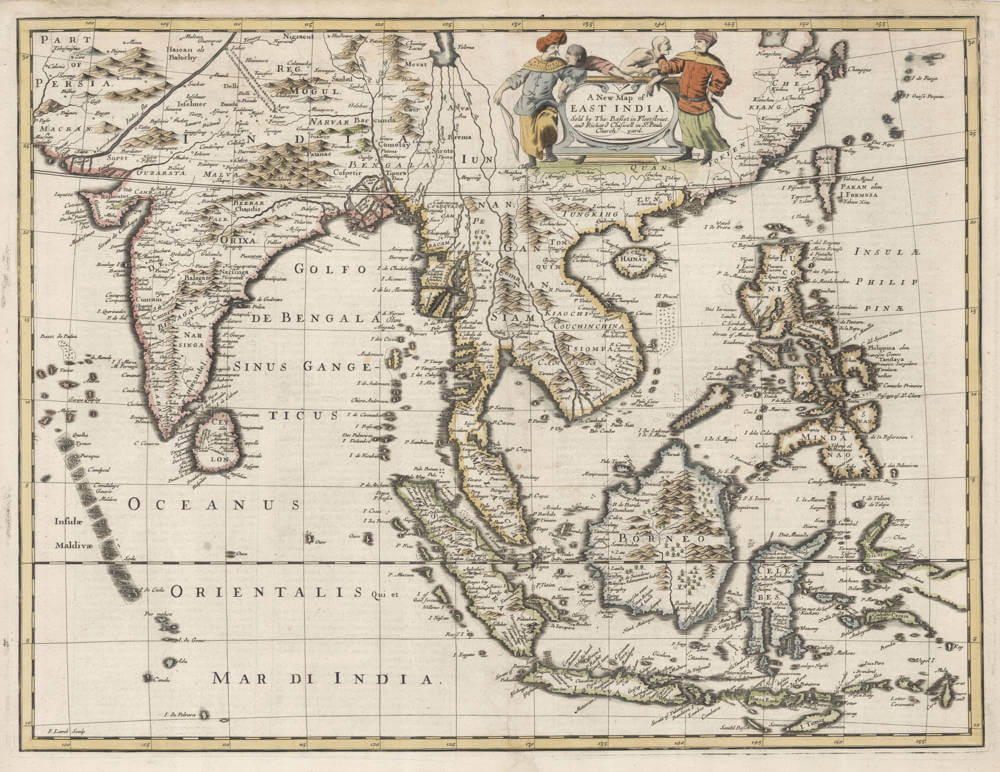 The first edition of the Prospect did not include a map of the East Indian Islands and the public had to wait almost fifty years until the 1676 edition before that omission was remedied. ‘A New Map of East India’ was one of seven new maps added to the 1676 edition of A Prospect of the Most Famous Parts of the World. The map was engraved by Francis Lamb and published by Thomas Basset and Richard Chiswell in their St. Paul’s Churchyard premises. The map was closely copied from the earlier map of Frederick de Wit published in 1662 with a similar outline and title cartouche showing two turbaned native figures.