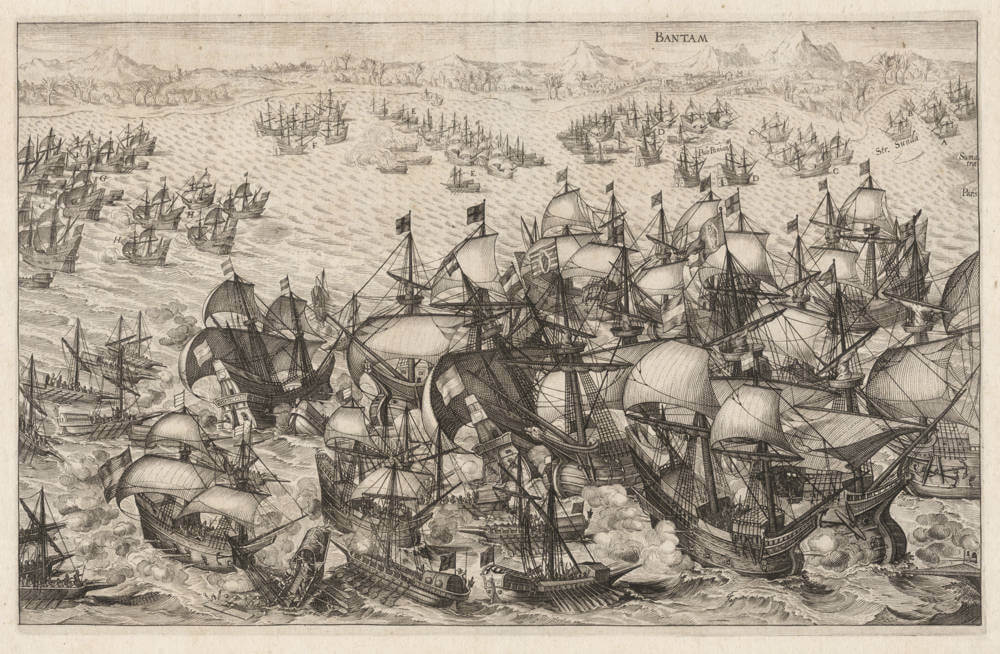 The famous print of the Naval battle of Bantam, a decisive Dutch victory over the Portuguese in the power struggle for the spice trade.