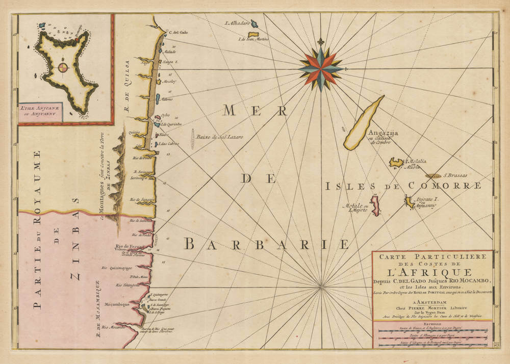 Pierre Mortier's rare chart of Eastern Africa and the western Indian Ocean, one of the first to focus on the Comoro Islands. It names all three islands as well as the disputed island of Mayotte, here also named Motale. The inset on the upper left shows one of the Comoro Islands, Anjoane or Ndzuani. The coastline focuses on Mozambique from Cape Delgado in the north to Rio Mocambo, just south of the city of Mozambique. The sources used are mainly Portuquese, reflected by the nomenclature used on the map. In addition, the chart has been embellished with a strong compass rose on the upper centre.